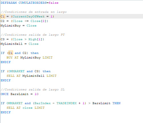 Como trabajas en gráfico diario y las estrategias SIEMPRE se ejecutan al cierre de la vela, para asegurar que la posición esté abierta el lunes debes darle la orden de abrirla al cierre del VIERNES.