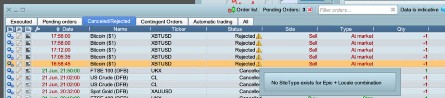 When I run one of my strategy codes, backtesting is fine but when it is live on demo account when it triggers to go long or short, the order would be rejected with this error message: “no site type exists for epic + locale combination”, the strategy stops and RTP put it in the “NOT Running” codes. Does anyone here know what is that error code?