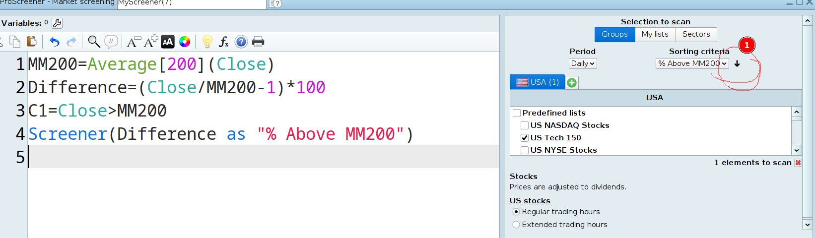 Je souhaite créer un screener qui me montre toutes les valeurs qui sont au dessus de leur mm200 et je souhaite uniquement garder les 10 valeurs le plus au dessus. Est ce que vous auriez une idée de comment faire ?