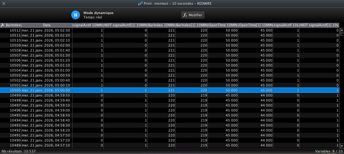 Je me suis un peu fait piéger lors de mes vérifications. Pour confirmer que AND NOT ...[1] faisait bien référence à la bougie 10 MIN clôturée précédant celle active, et qu’il y avait bien persistance de la valeur, j’ai utilisé des PRINTs sur BarIndex[1] ou OpenTime[1]. Ces valeurs correspondent bien à la bougie 10 MIN clôturée précédente avec persistance.