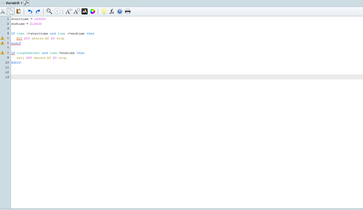 Il tuo codice non ha alcun problema, ma penso che tu lo stia utilizzando sotto “Indicatori” invece che sotto “BackTesting & Trading Automatico”…