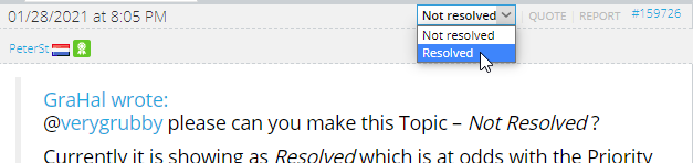Currently it is showing as Resolved which is at odds with the Priority 2 on the Wants & Bugs List (PeterSt) and we don’t want to confuse PRT when they refer to this Topic for more detail on the problem.