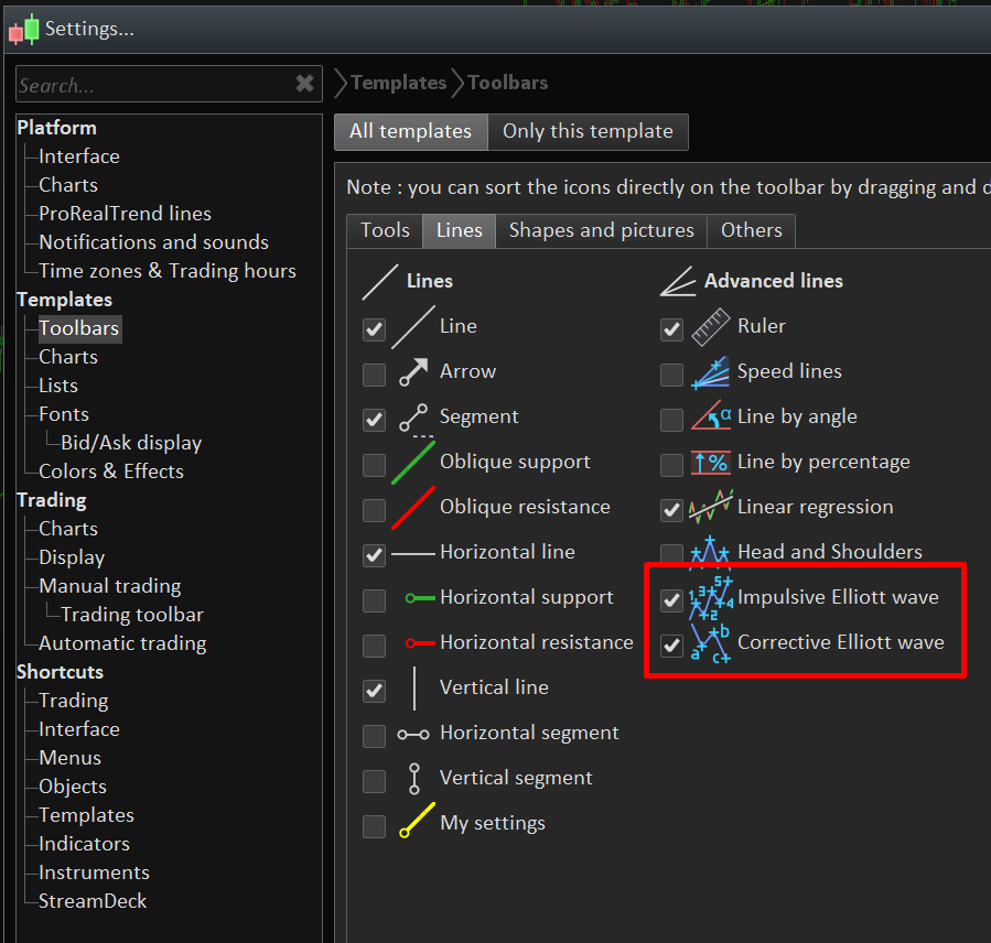 There are 2 tools to notate elliot waves in the platform, you can add them to your toolbar by checking them in the Templates/Toolbar section of the option (look attached picture).