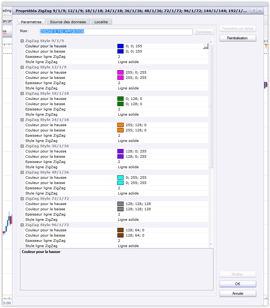 A l’origine de l’indicateur c’était Eurasien le créateur de la file ” on peut utiliser ZigZag pour trader en HP ” qui avait coder le ZigZag qu’il fallait entrer manuellement les uns après les autres, puis il a coder un indicateur tout-en-un. Voici un screen de la première mouture : il y a 3 variables par ZigZag => profondeur,déviation et backstep.