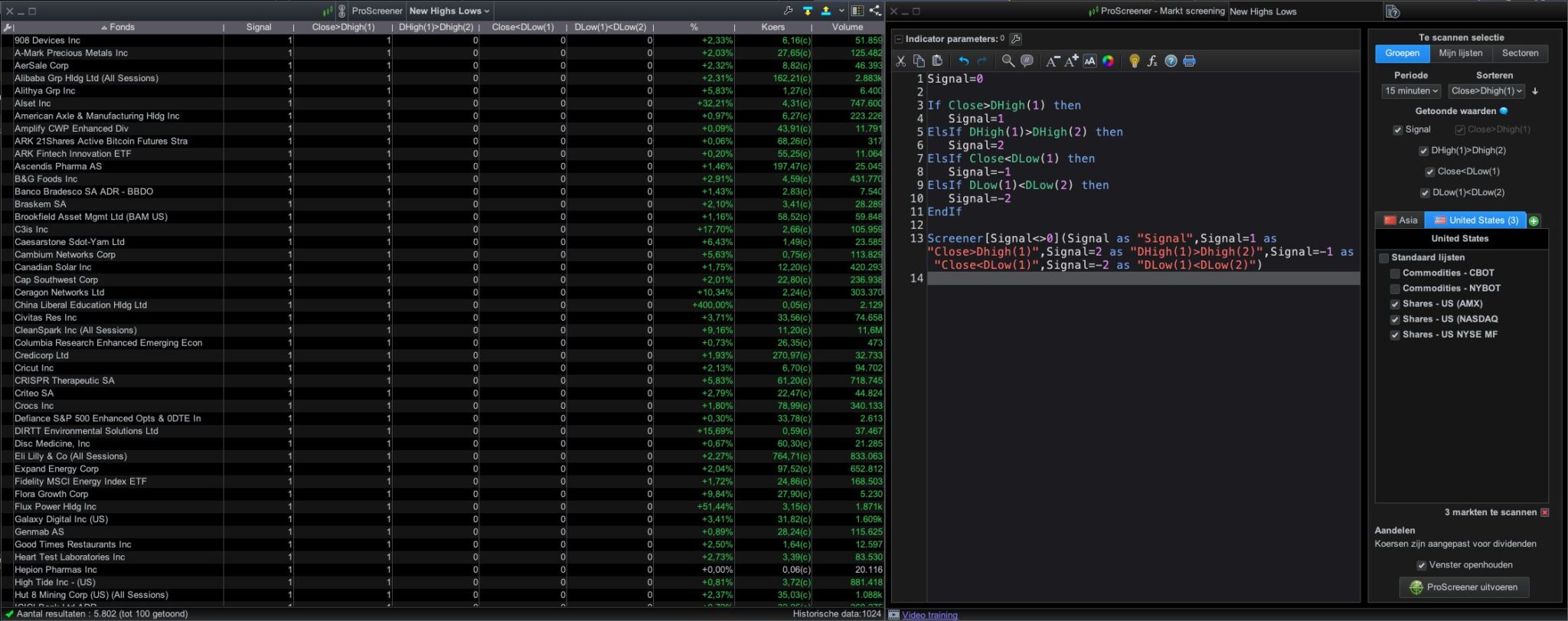 Screener[Signal<>0](Signal as "Signal",Signal=1 as "Close>Dhigh(1)",Signal=2 as "DHigh(1)>Dhigh(2)",Signal=-1 as "Close<DLow(1)",Signal=-2 as "DLow(1)<DLow(2)")