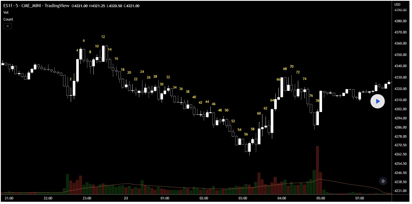 Bonjour a tous, je souhaiterais pouvoir tout simplement numeroter a partir d’un moment precis chaque bougie sur le graphique (comme sur l ecran en photo). En gros, que chaque bougie soit numerotée avec un chiffre au dessus ou au dessous. Existe il deja un code comme celui ci? Merci d avance.