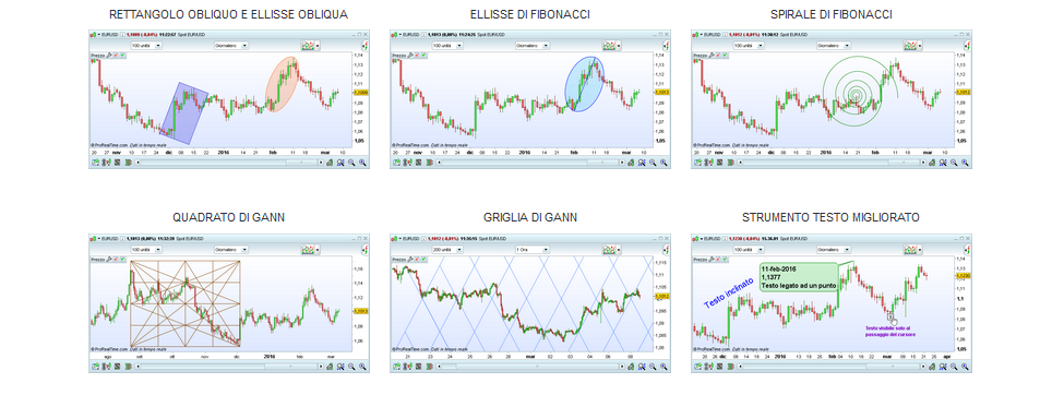 Modo testo migliorato – Possibilità di inserire un testo con link a un punto del grafico, visualizzare data e prezzo, visualizzare il testo unicamente al passaggio del cursore del mouse, modificare l’angolo.