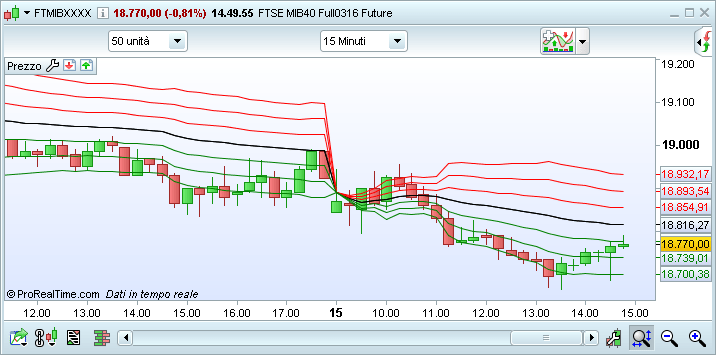VWAP e VWAP bande – Il VWAP mostra il prezzo medio ponderato del volume tradato sul volume totale per un periodo di tempo. Le bande VWAP sono calcolate applicando uno “Scarto Tipo” (simile alle bande di Bollinger).