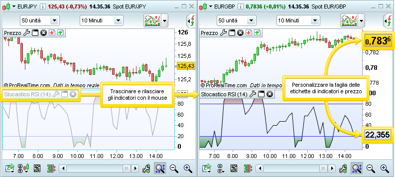 * Gli indicatori possono essere trascinati tra i diversi grafici.