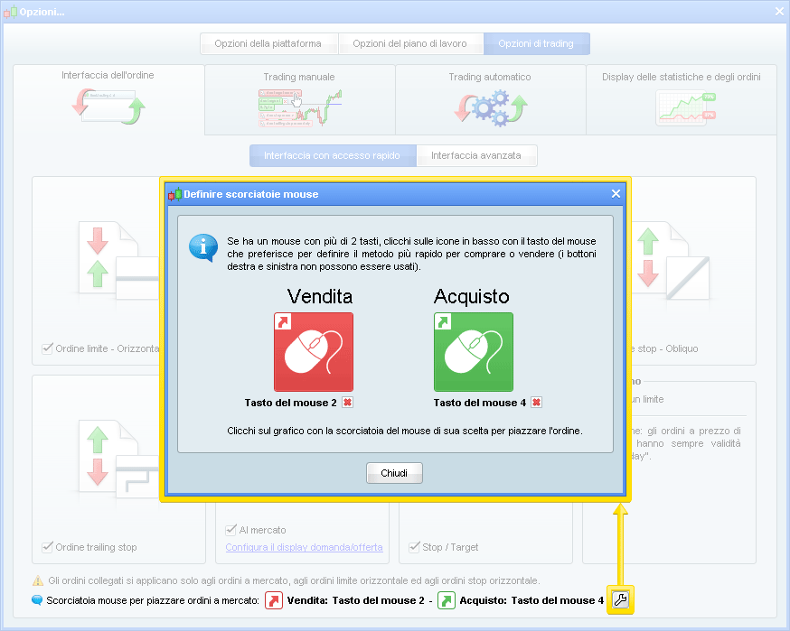 Può ora assegnare ai tasti del mouse scorciatoie per piazzare ordini cliccando direttamente sul grafico.