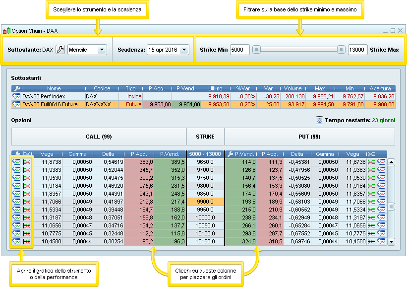 * Può scegliere una data di scadenza e filtrare per strike minimo e massimo.