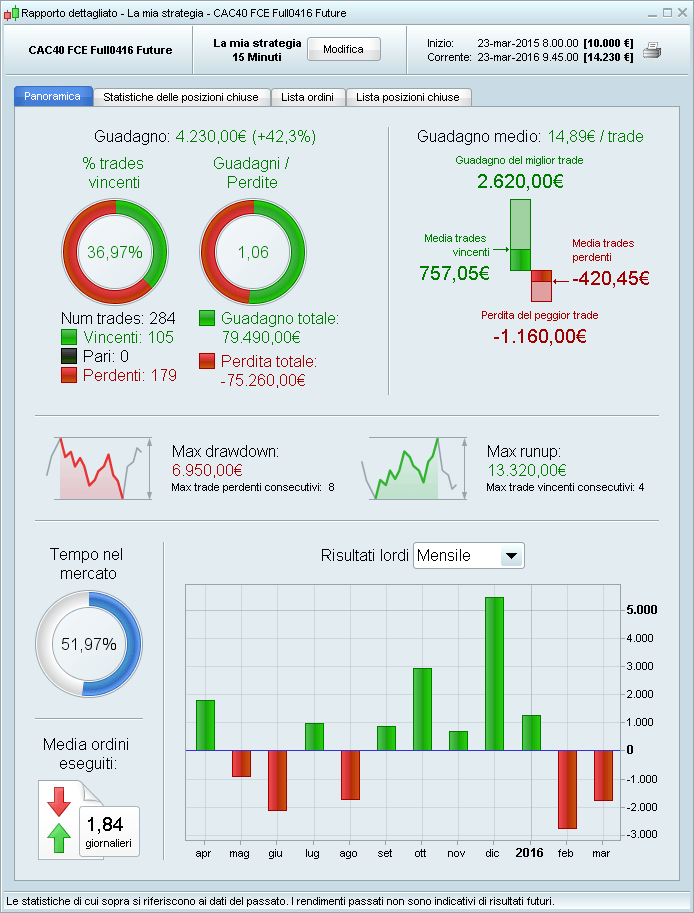 La finestra di rapporto dettagliato contiene il grafico dei risultati lordi. Possono essere visualizzati su base settimanale, mensile, trimestrale o annuale.