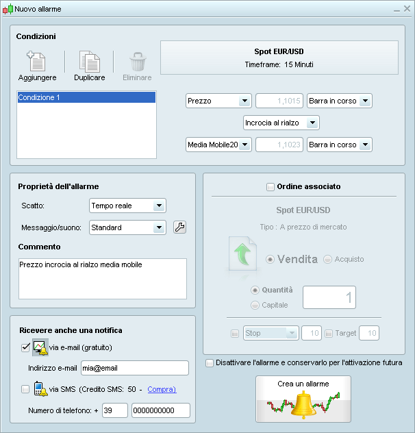 * Più condizioni per gli allarmi (es: incrocio al rialzo, incrocio al ribasso)