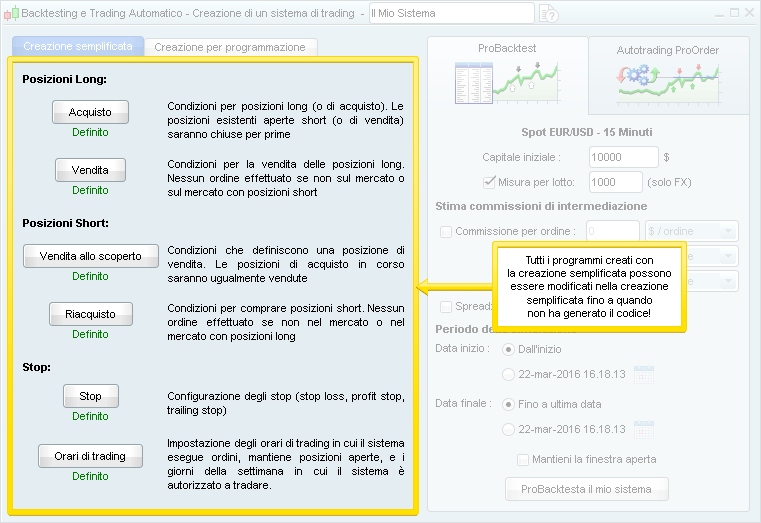 * Può ora definire i giorni e gli orari della giornata in cui il sistema può tradare in modalità di creazione semplificata.
