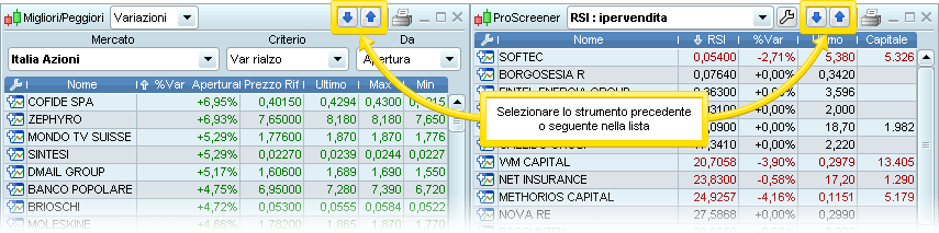 * Nuove frecce (verso l’alto e verso il basso) per selezionare lo strumento successivo o precedente nelle liste (incluse ProScreener e Migliori/Peggiori).