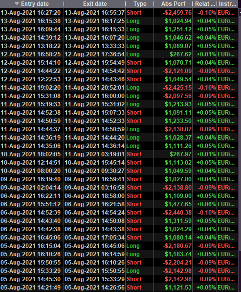 Anecdotical : This summer holidays my son wanted to learn the autotrading stuff too (he can trade just the same). This week, well into his holidays, he seems to have his first “ever winning” strategy, with me as a teacher and him as the creative mind (it seems senseless to let him make the same as I do). This is near 100% about turning your creativity into something which is “programmable”. It also is a lot about how the most gains emerge. Is it shorter trades and how to achieve that ? Is it boring longer trades with deeper SL’s always being afraid the Loss will occur ? Is it waiting for the higher profit which may not be reached and instead turns into a loss ? … below you see my deliberate LESS earning “always winning” strategy which these days is still boring because of low (holidays) volatility. But for me it is about the fun (ha ! another order entered !). This one normally does 250 trades per month which is 10+ per day and there is something to look at.