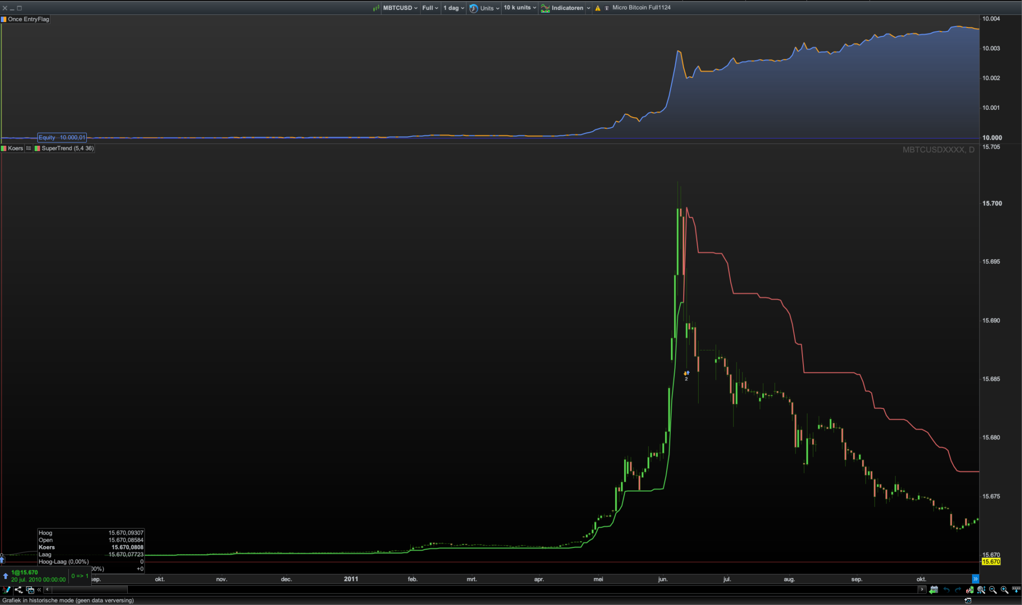 I think I know why this happens. When the first position is opened, and within 36 units an opposite position should be opened by the indicator, it goes wrong because the indicator hasn’t had time to configure itself yet. You can solve this by using the period of the supertrend (36 units) as “PreLoadBars.”