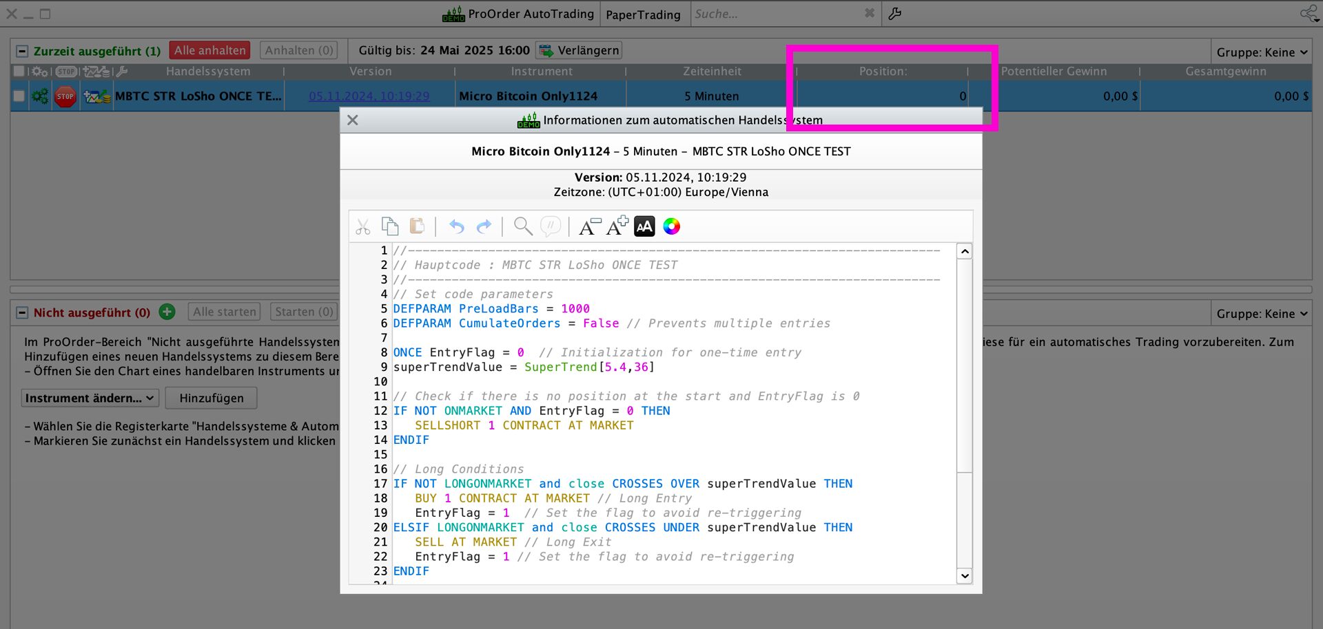 Just to clarify my goal here: I’m aiming for an immediate entry into a long or short position (I’d adjust the code accordingly) as soon as I start the auto trading system, without having to wait for the next signal. We’ve only increased the PreLoadBars to ensure that the first signals from the SuperTrend indicator are accurately interpreted AFTER the immediate entry.