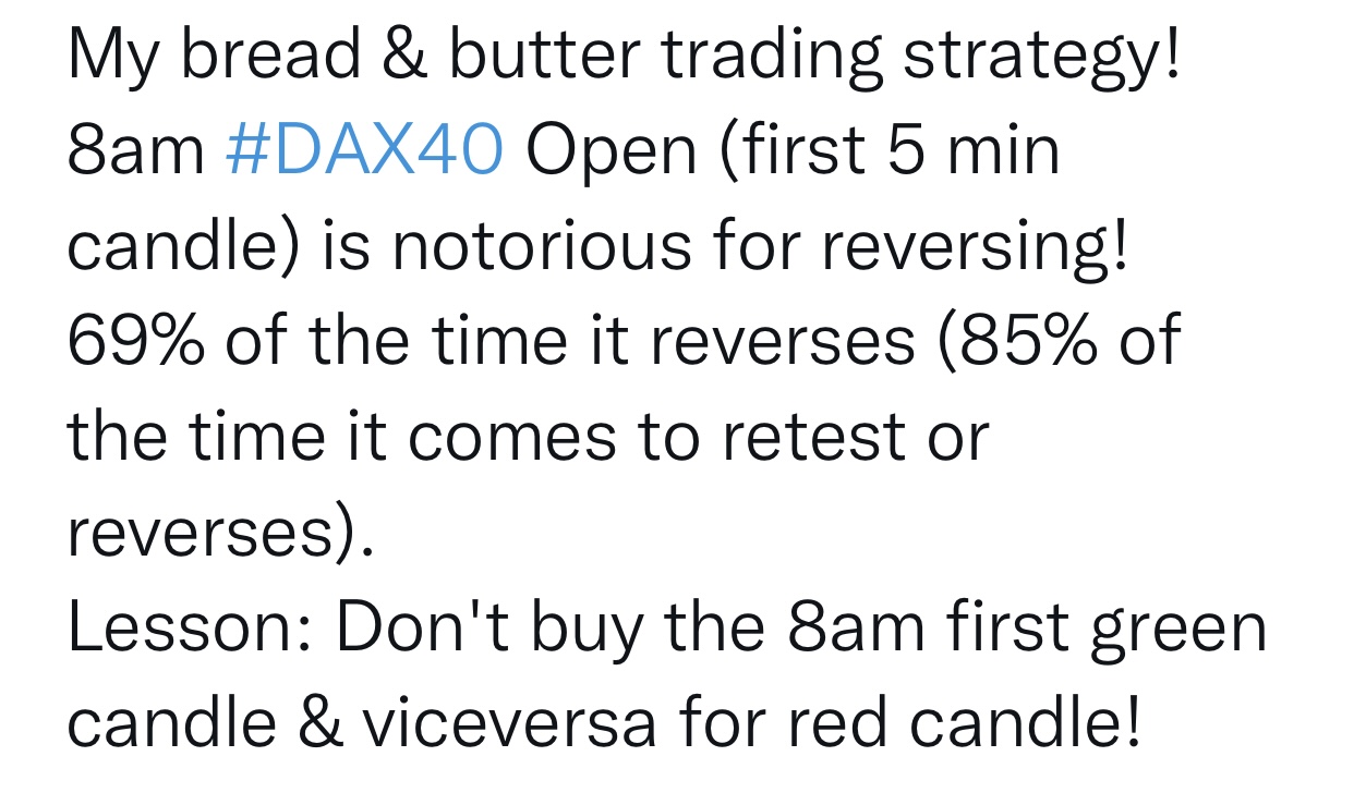 - at dax open. wait for 5 min candle close, if it closes GREEN, go SHORT next candle open, TP open candles low + x points.