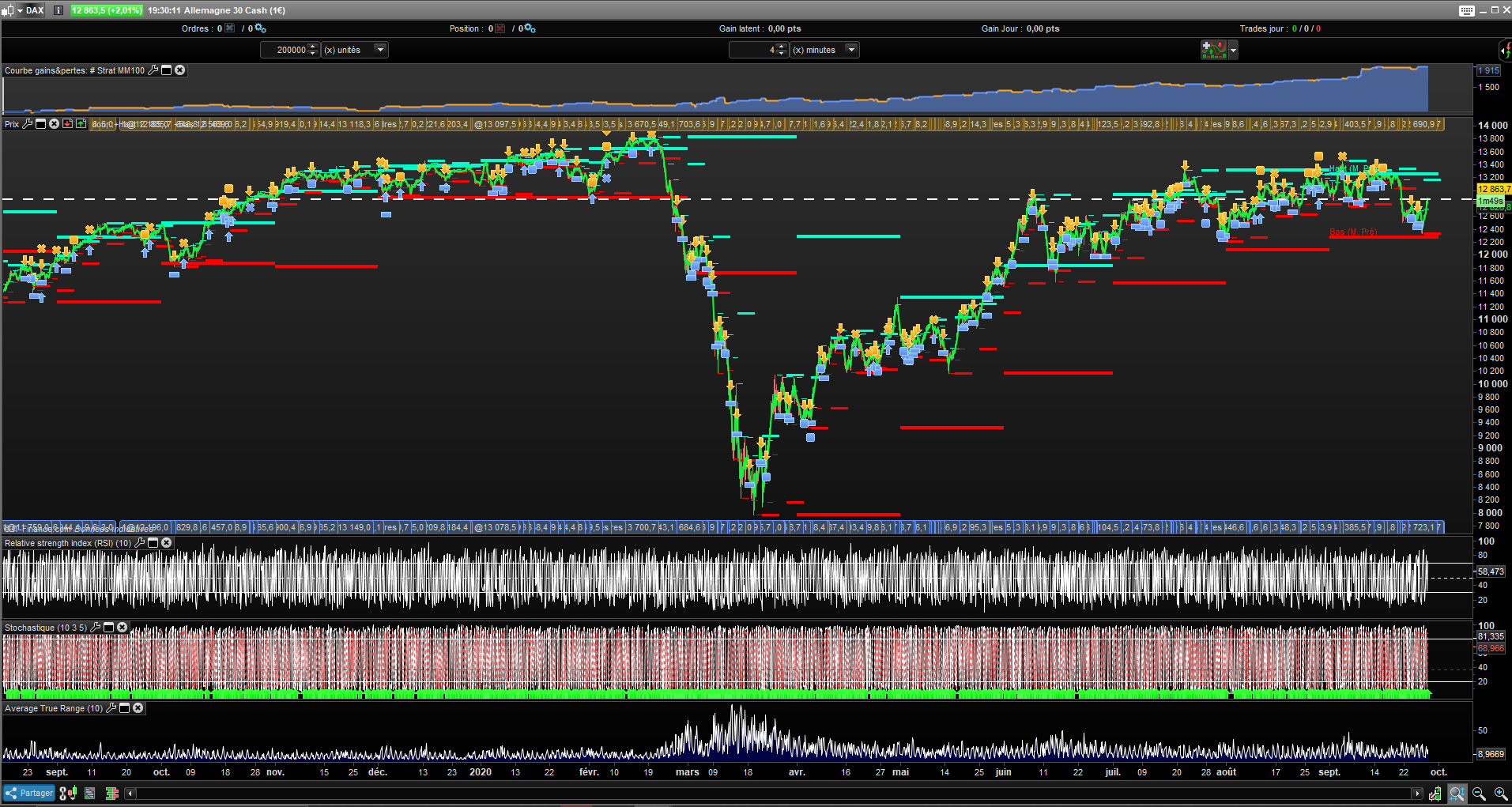 Je joins ici un petit code polyvalent en UT 4 minutes (DAX30 uniquement sur CFD), l’idée et de prendre des positions en exploitant une MME100 et une stoc.