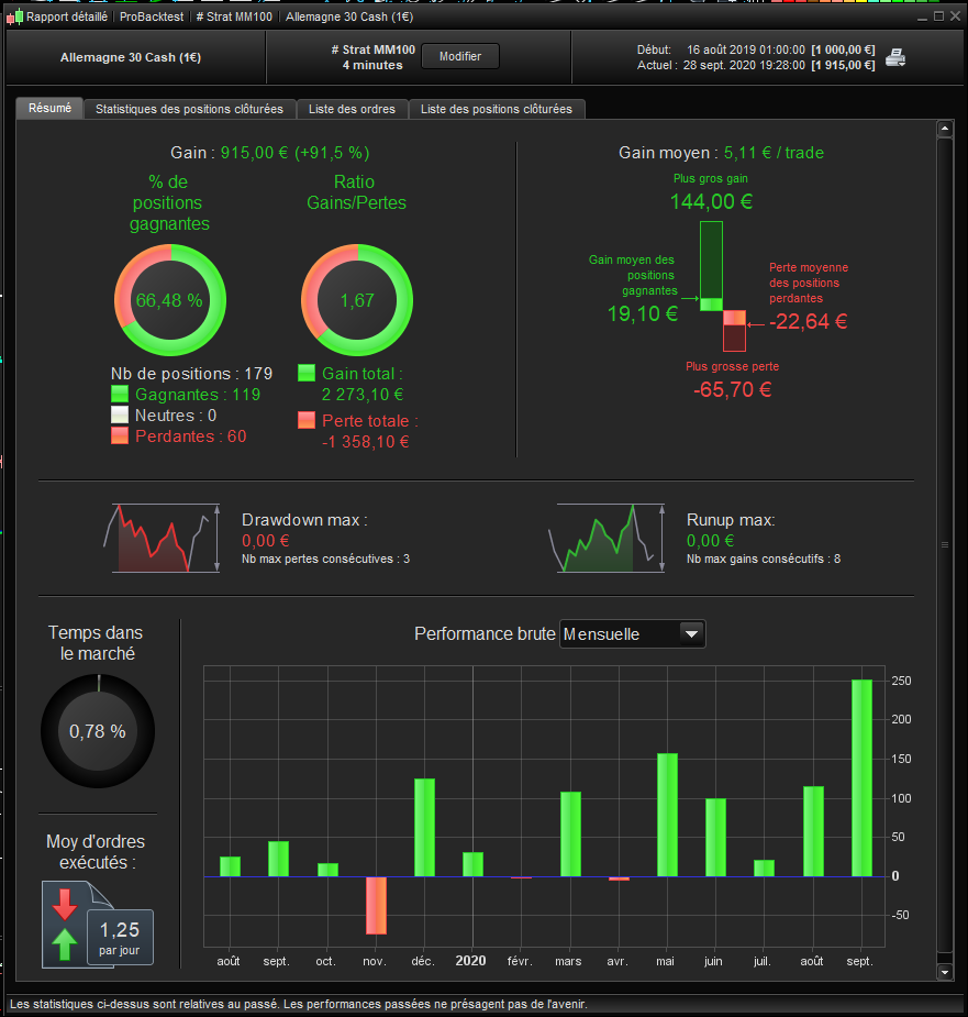 C’est pas trop mal mais je cherche des idées pour l’optimiser, peut-être pas dans l’idée de prendre plus de position mais plutôt supprimer des trades perdants (sans optimisation PRT), plutôt optimisation sur l’ajout de filtres etc…
