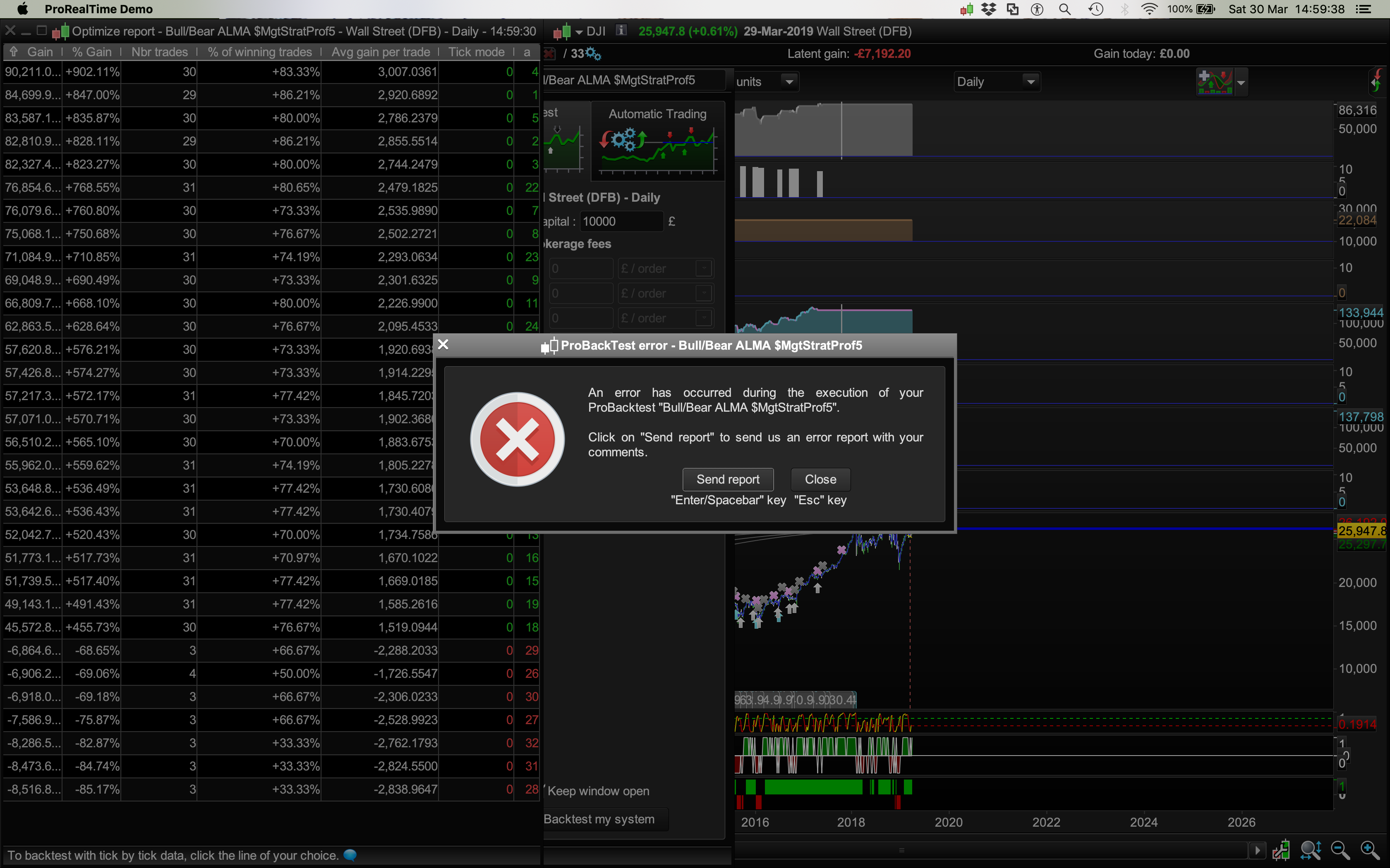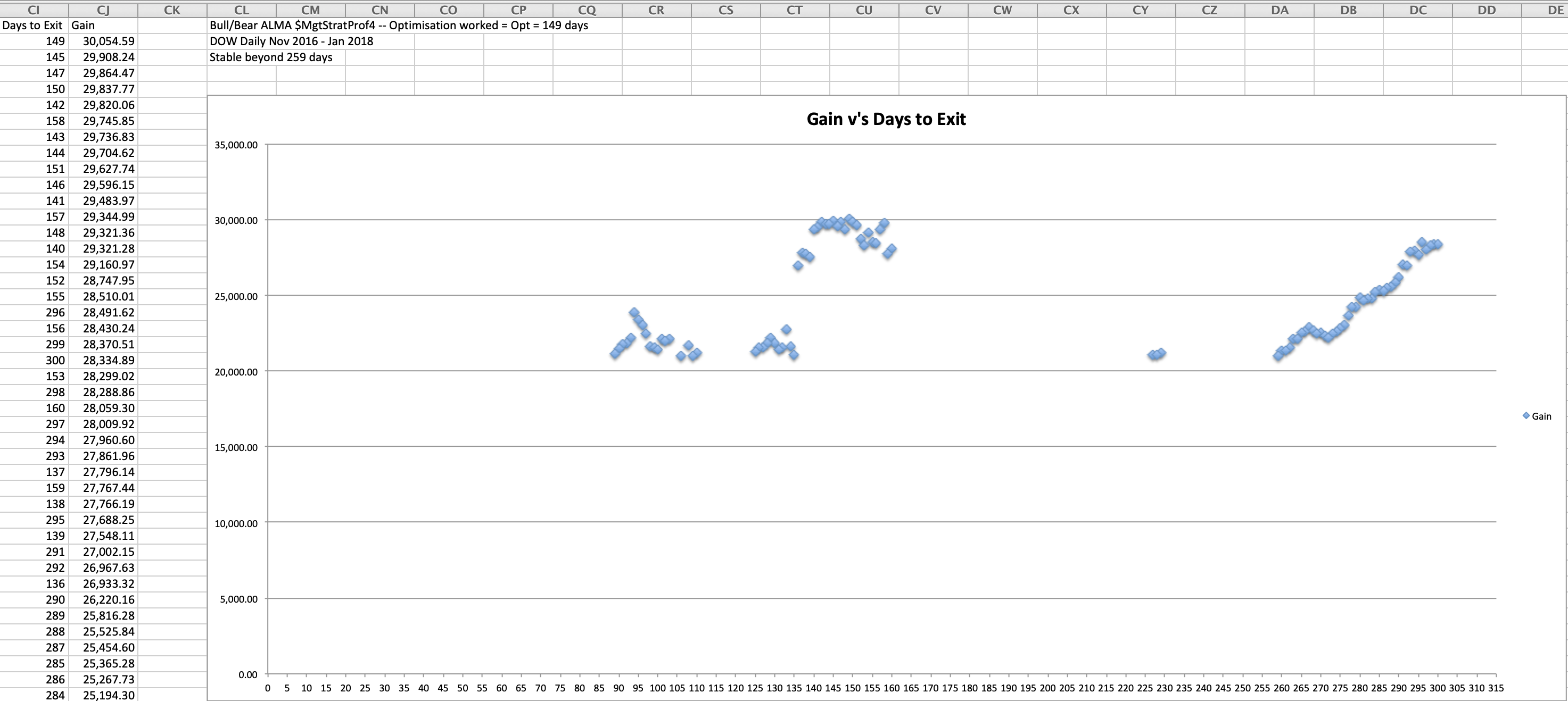 Mine, it turns out didn’t like the date range Aug 2010 to Oct 2017, but when I optimise the system for the Trump rally Nov 2016 to Jan 2018 it optimises and shows 149 days is optimal time to hold before exiting a trade and produces 30k profit BUT… then I use 120 days as it seems to be a number the optimisation results are missing and don’t have a value for (pls see Excel screenshot) and the system makes £100k?