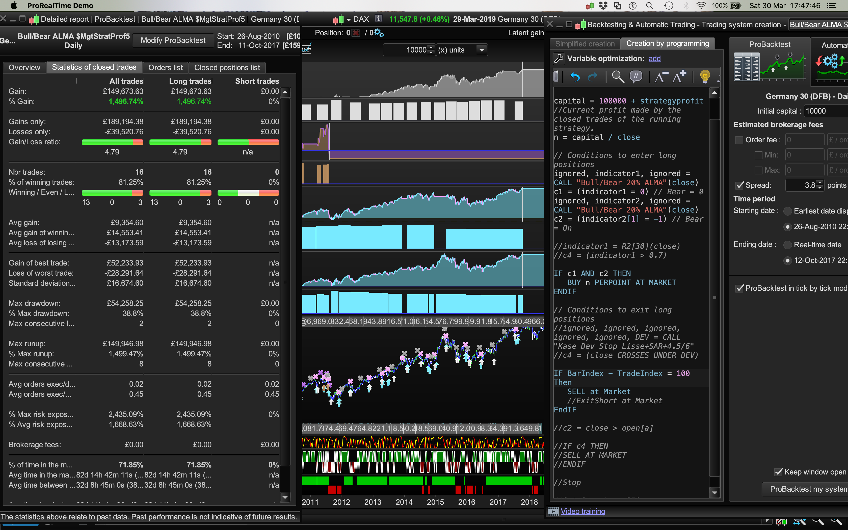 Thanks for making the code more efficient Vonasi and showing me that Summation code! This “buy on the Bear spike” with the strategy profit trade size algo did £159k on the Dax – same dates – with 38% Drawdown, typical of trend following systems. See attached. The trade exit = 100 days was a random figure and the first I tried.