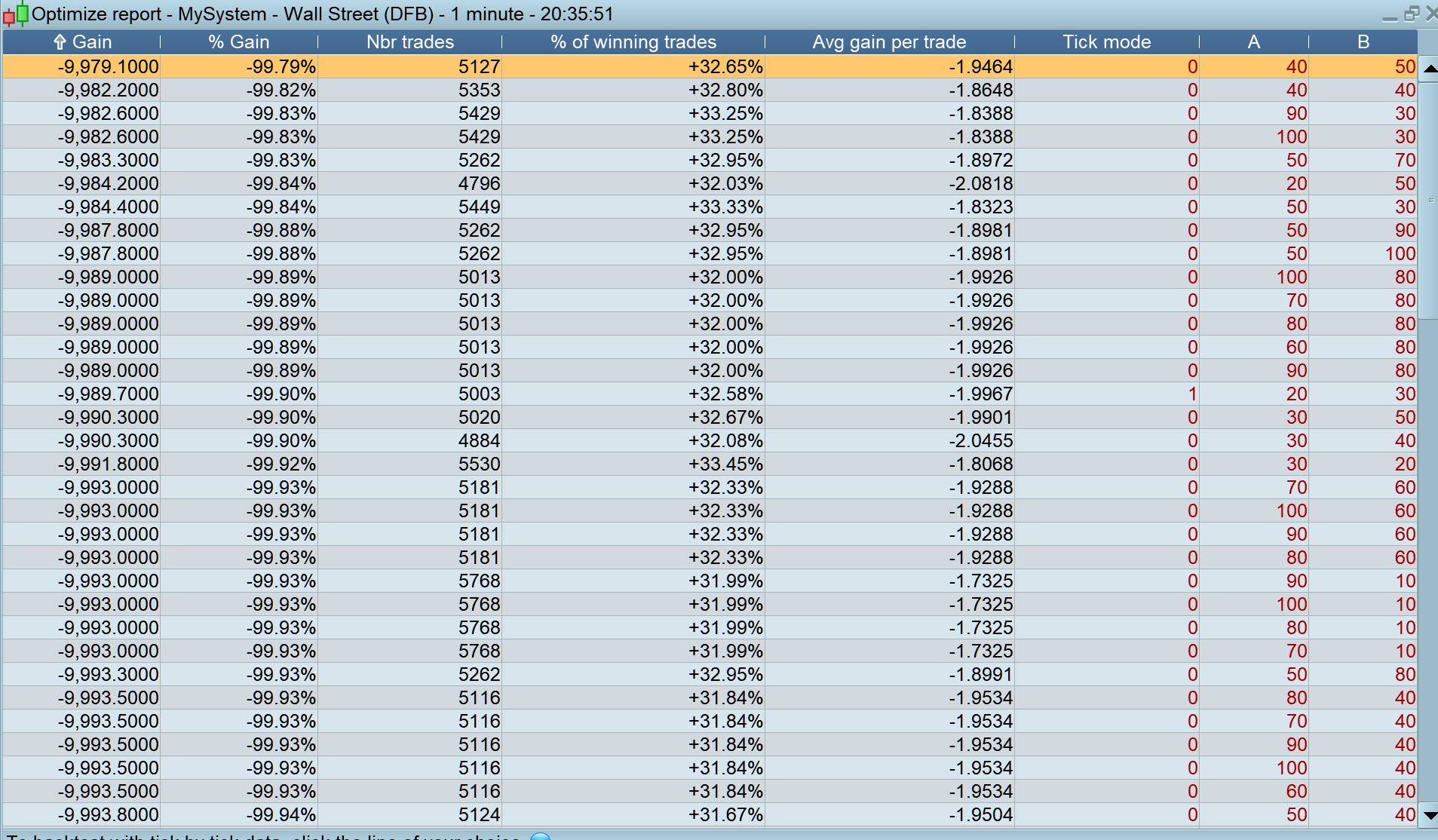 Any ideas? It seems to be behaving as if I have unticked the Probacktest tick mode because the profits achieved in the optimisation window are replicated in the Detailed Report when the box is unticked and tick mode is off and I enter 50 ticks for the profit target and 20 ticks for the stop loss (removing optimisations values a and b).