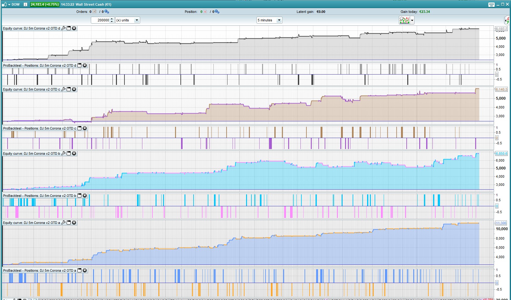 I have been steadily trying to avoid the temptation to optimise everything. For years I tried to optimise my wife. You can imagine how well that went. So this version has precisely zero optimisation. All the values were set in advance, either at traditional defaults, or because they seem sensible regardless of the curve. The only variation is the crossing pair of MAs, as selected by @Jan’s program. Everything else stays the same, 4 variations each doing one trade per day. No idea if this makes sense theoretically, but so far the numbers look good.