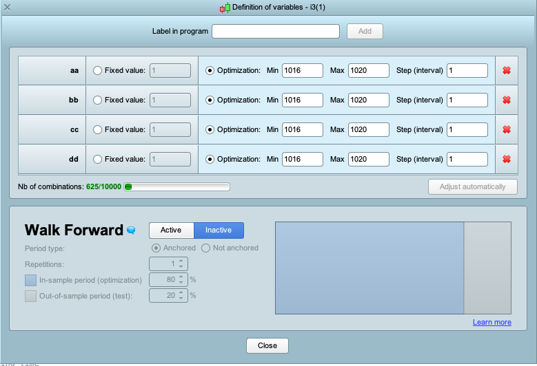 I tried to optimize different bull variables of HeikinAshi, but I am obviously doing it wrong. My logic was to define each indicator with a number; 1016-1020 and then labelling them as aa-ff in the optimization tool. Thanks in advance!