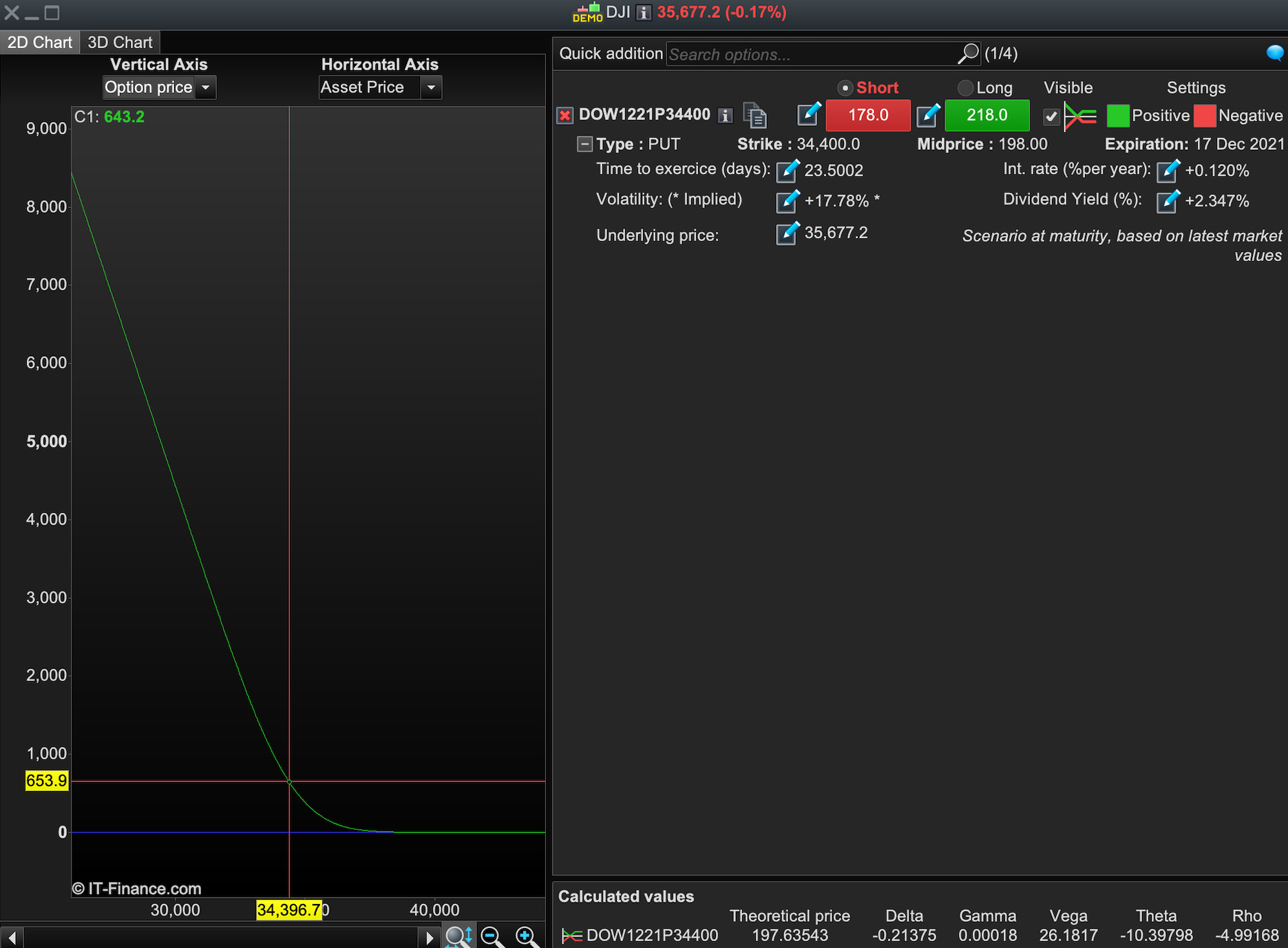 When calculating the initial option price, you have assumed an underlying price of 35,677.2 (Dow Jones price), at this price your short put has a value of 178.
