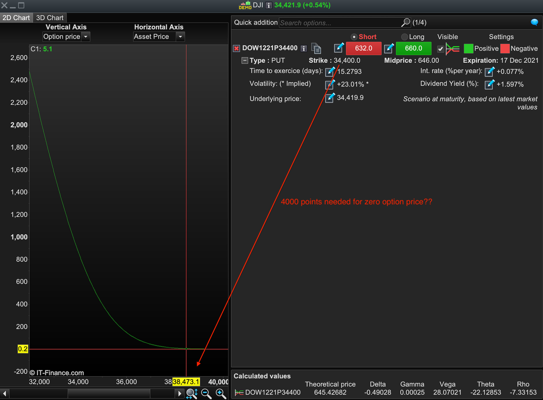 I wondered if you could take a look at this image below. According to a PRT Options chart that Dec 17th 34,400 Short Put needs to go about 4,000 points higher (Dow 38,473) for the option price to reach zero? That can’t be right? I don’t believe I’ve mixed up the Strike with underlying as I did above.