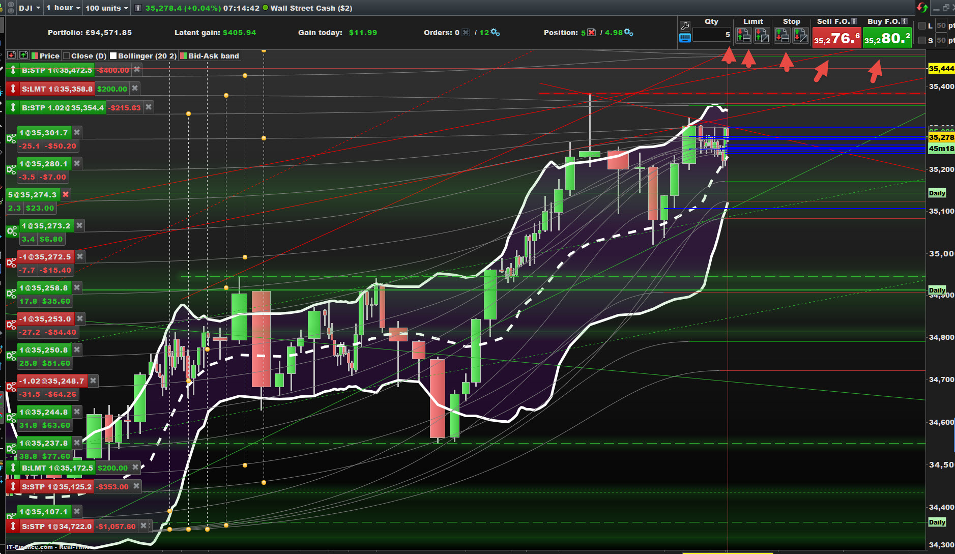 So I buy 9,78 contracts. Next I individually set as many limits as a like, in either direction (or at either side of the price).
