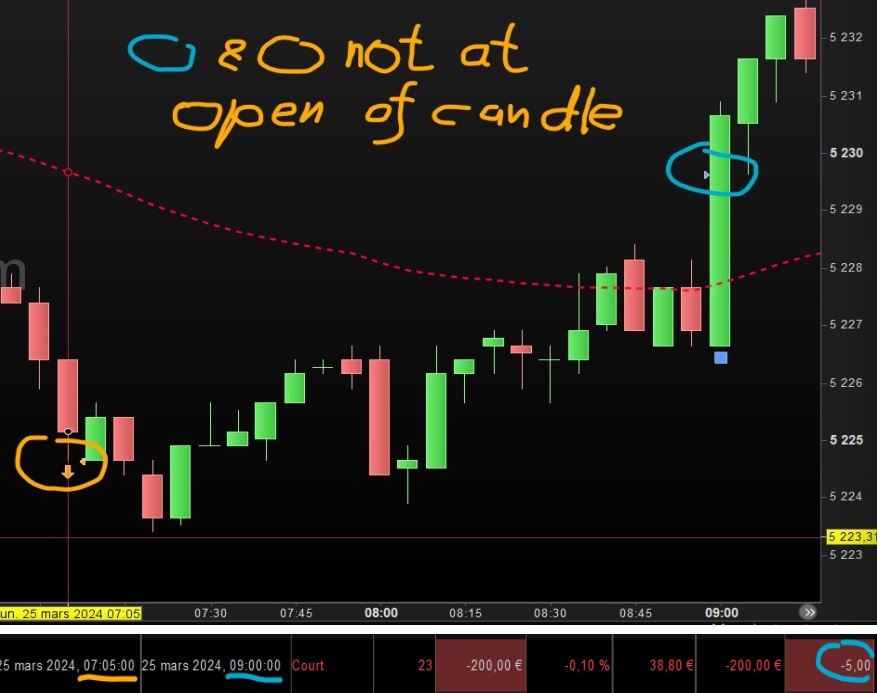 The little triangles on the chart are, for the entry, at the low end of the bottom wick, and for the exit somewhere full in the body of the candle. I call that “they are not at the open of the candle”. But they are exactly ont the levels I wanted them.