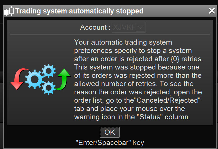 Automatic stop of a trading system due to order rejection: