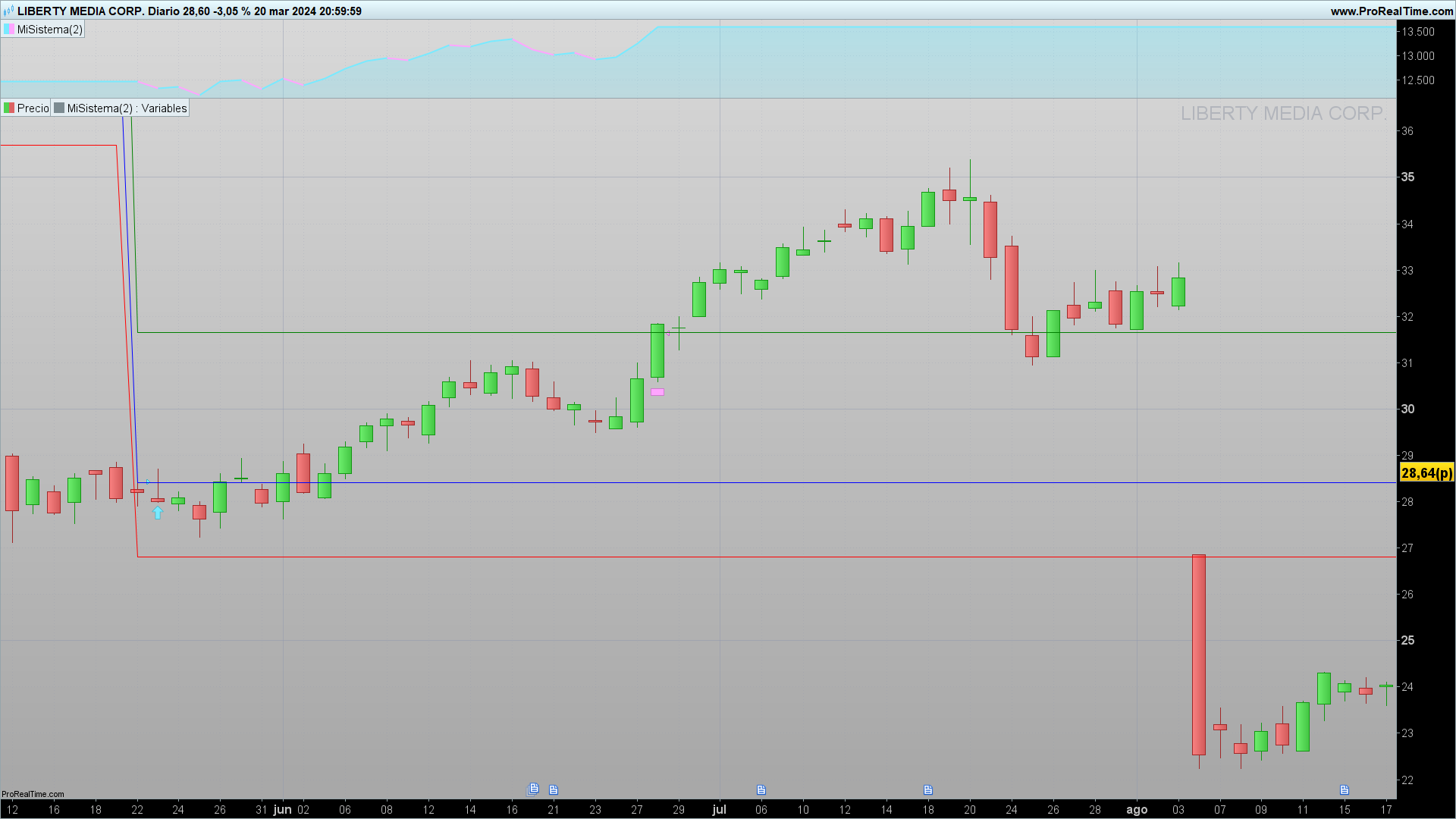graphonprice. Ecco un esempio di un sistema che inserisce un ordine di acquisto a un determinato prezzo insieme al suo stop loss e take profit.12345678910111213141516smarap = average[10,1](close)smalen = average[60,0](close)///setup longc1 = smarap crosses over smalenif not onmarket and c1 thenbuystop = highstopprice = lowest[15](low)profitprice = buystop+2*(buystop-stopprice)buy 10000 cash at buystop stopset stop price stoppriceset target price profitpriceendifgraphonprice buystop coloured("blue")graphonprice stopprice coloured("red")graphonprice profitprice coloured("green")Le linee blu, rosse e verdi vengono aggiornate con ogni nuova voce.