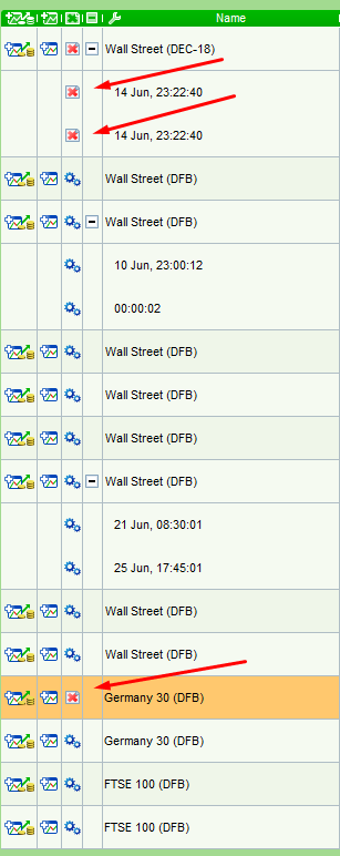 The best place to check for orphaned strategies is in the ‘Open Positions’ window. Positions still under auto control will have a cog next to them and positions under manual control will have a ‘x’ next to them to close the position. If you click on the ‘+chart’ next to the position then a chart will be opened and you can then find the position and manually add stops and targets or close it if you want. It is best to do this check every time a strategy gets stopped even on demo as it is good to get into the habit for when you are trading live..