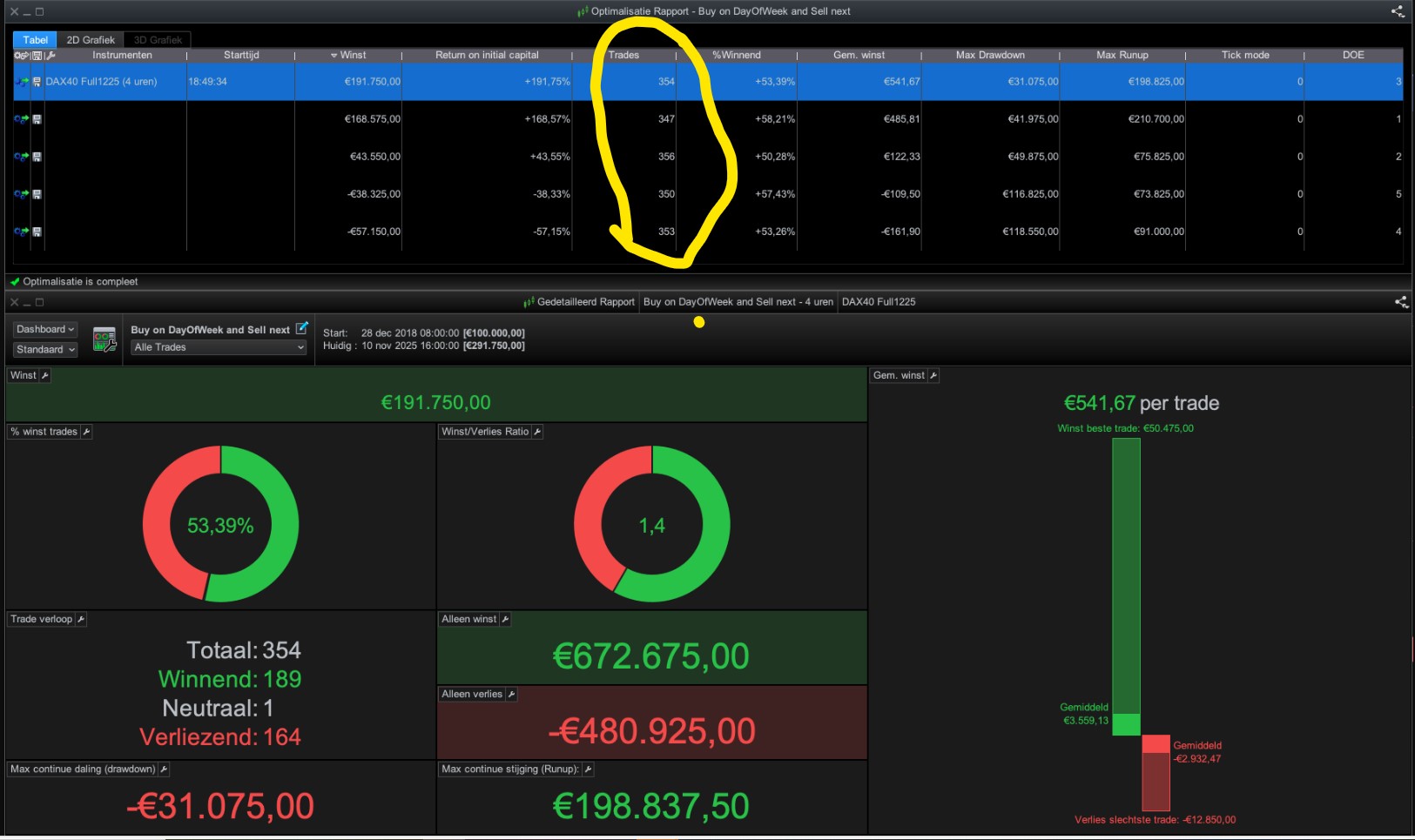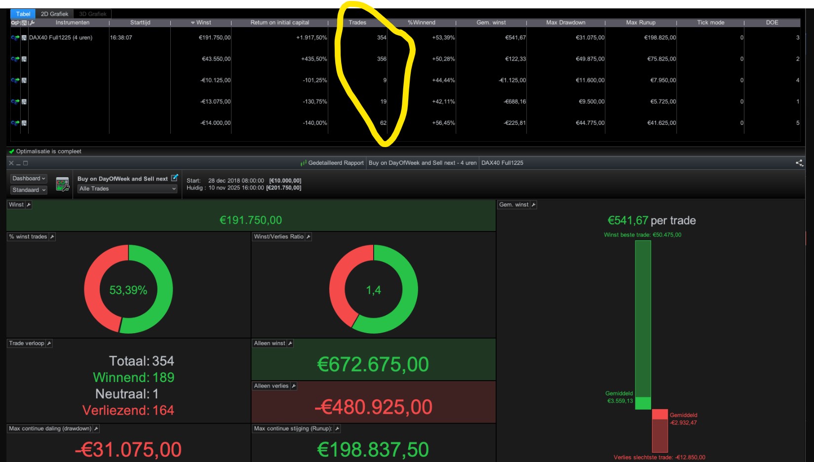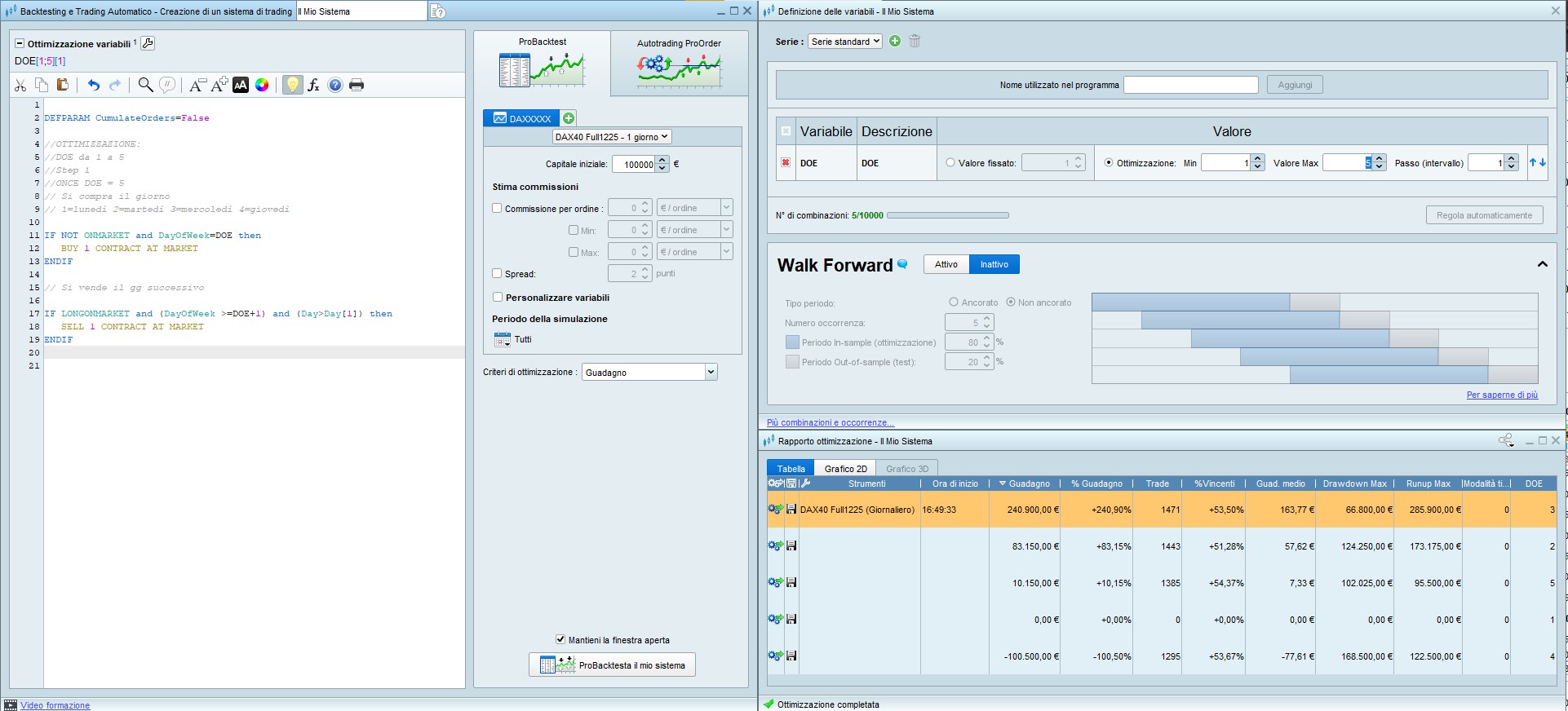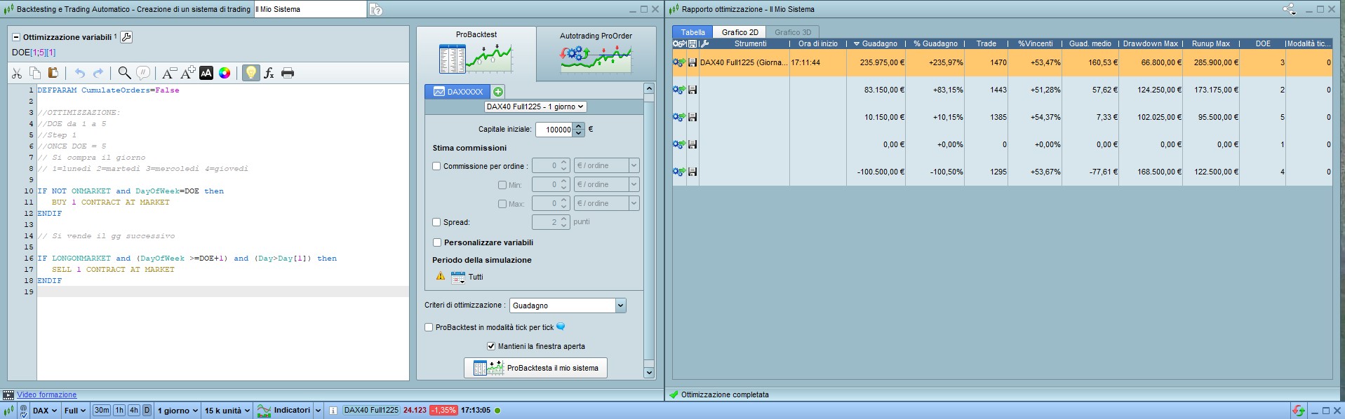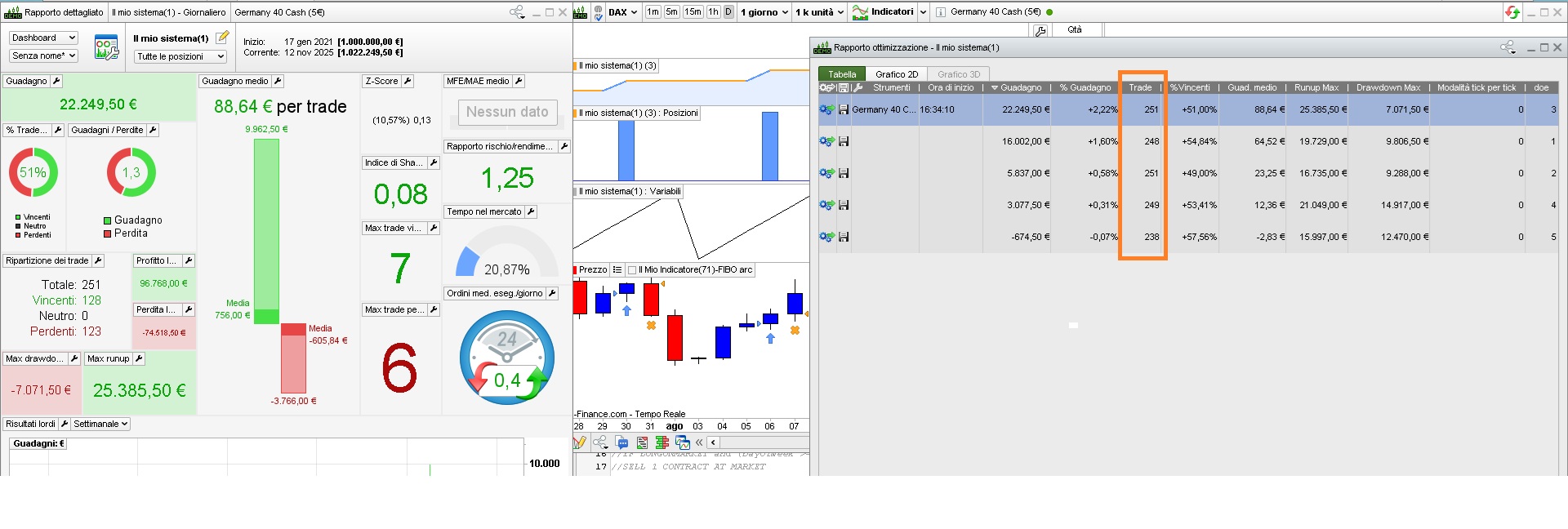 Come puoi vedere dalla foto, sul DAX, Giornaliero, l’ottimizzazione mi da quasi sempre gli stessi trade. Non possono essere esattamente gli stessi perché ci saranno dei giorni festivi o di chiusura in alcuni di essi.
