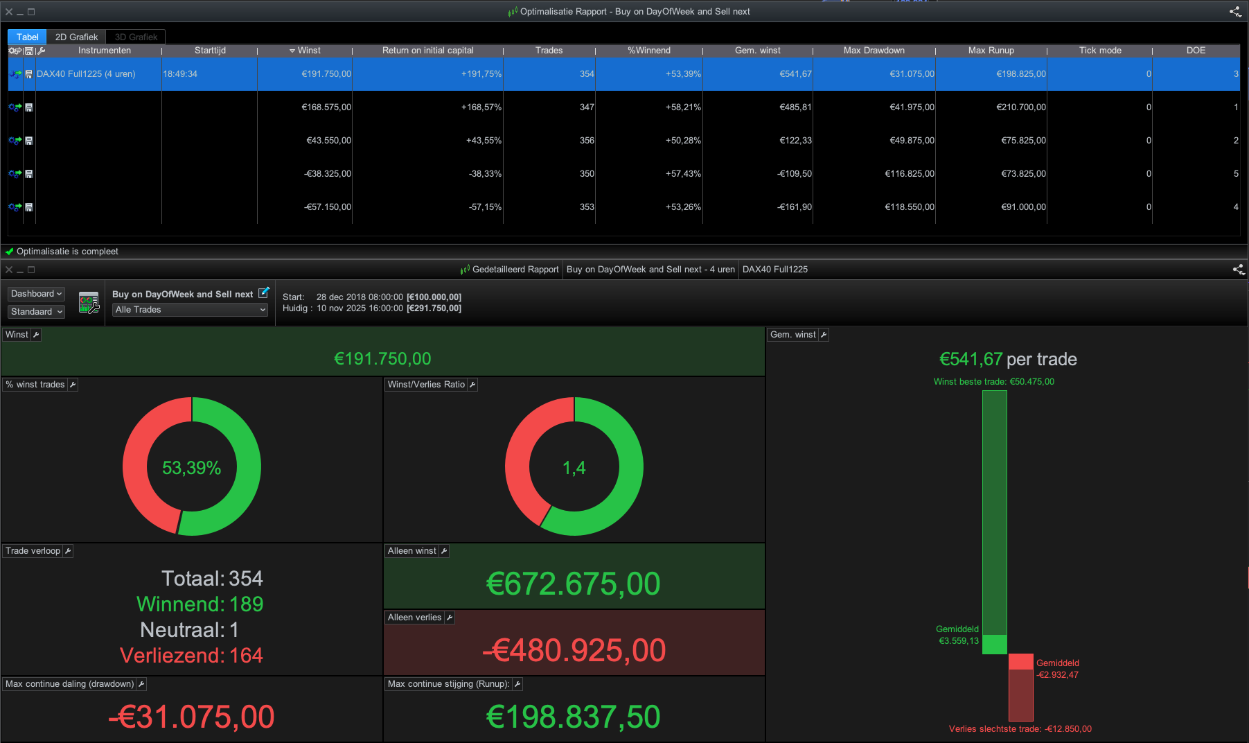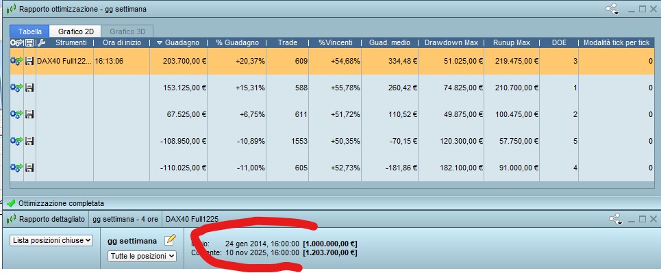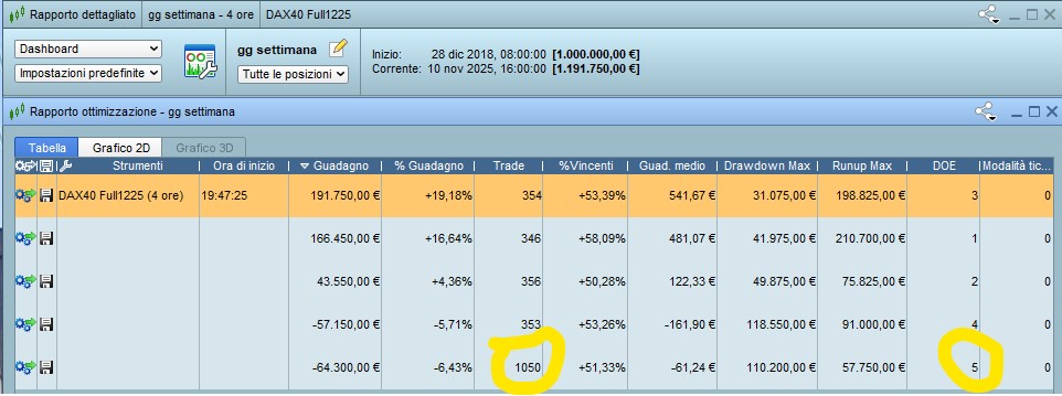 Questa ottimizzazione/backtest è stata eseguita sul DAX40 Full1225 (grafico a 4 ore) e su 10.000 barre…