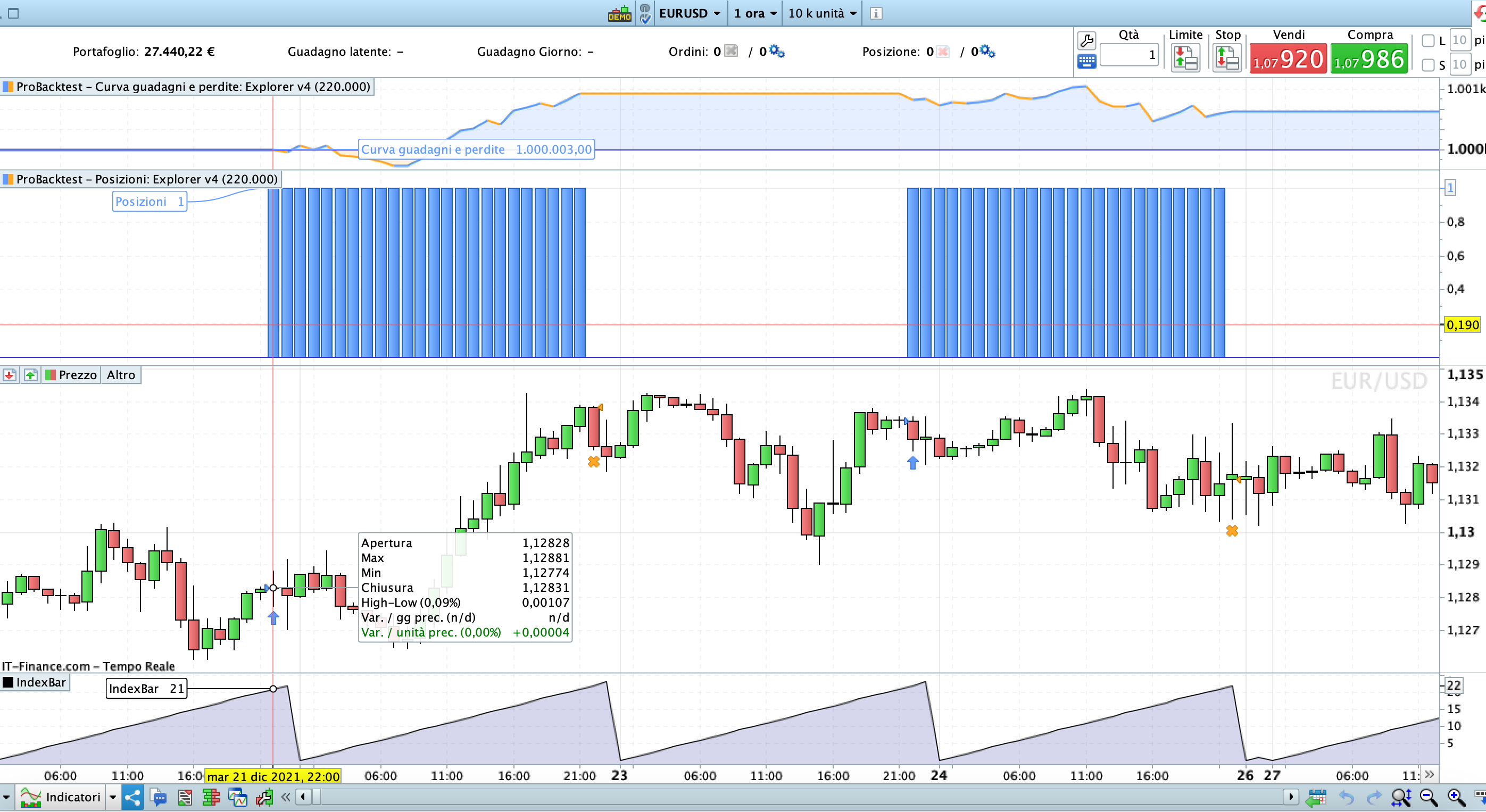 Questo però è quello che succede: il sistema compra e vende correttamente ma parte da orari che decide lui e, soprattutto, effettua operazioni un giorno si ed uno no. Sotto ho messo anche un indicatore per evidenziare la barra della giornata.