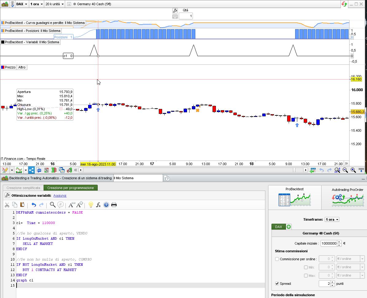 Quello che cerco di fare io è avere un sistema che TUTTI I GIORNI (ovviamente giorni in cui il mercato è aperto) apra la posizione all’inizio della barra oraria e la chiusa all’inizio della barra successiva (per scopi di analisi)