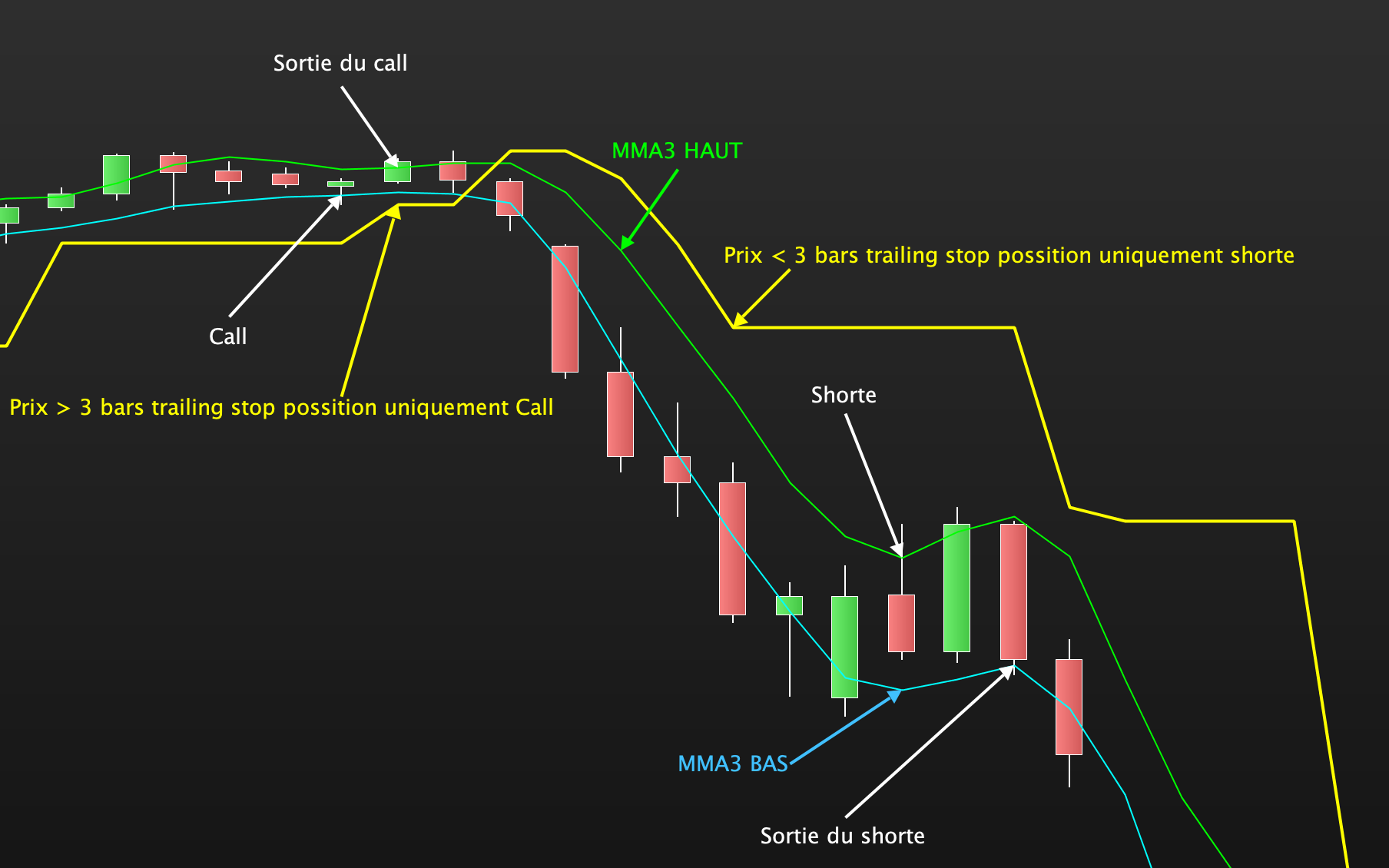 Dans cette version les positions se ferment à l’inversion de ton indicateur 3 bars Trailing stop :