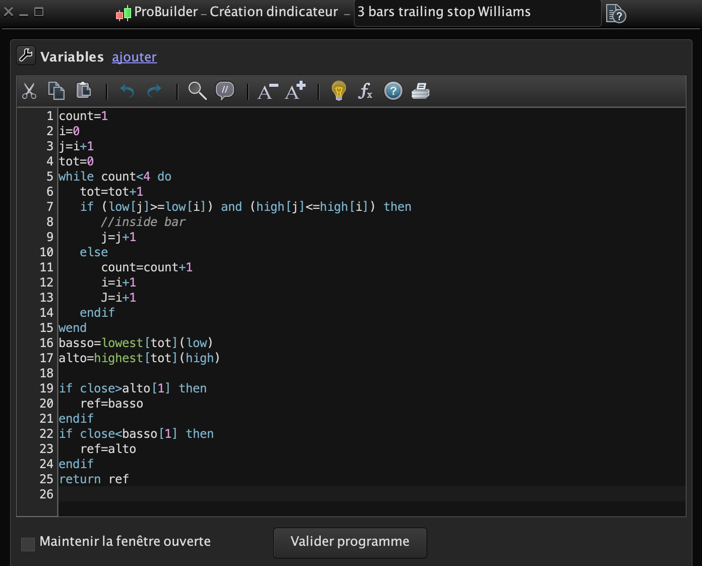 ci joint la capture d’écran du code le l’indicateur ( 3 bars trailing stop Williams) .