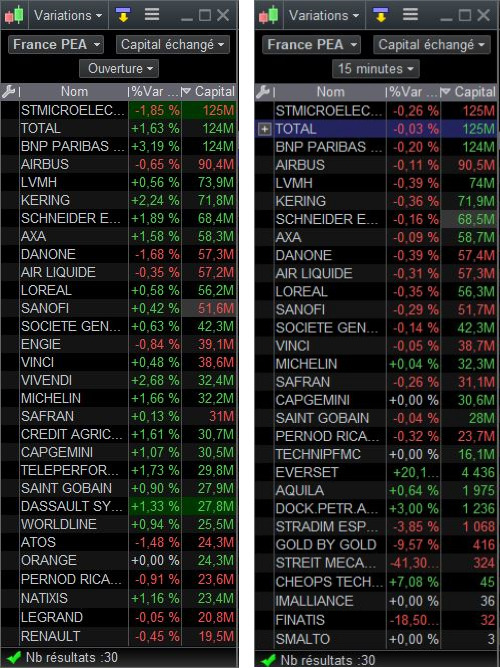 J’utilise prorealtime 11.1, version fournie par Boursorama avec mon PEA. Je rencontre un problème avec le palmarès “variations” avec le critère “capital échangé”. Quelle que soit la période de temps choisie, la valeur du capital échangé reste la même. Et la liste des valeurs remontée par le palmarès change très peu également.