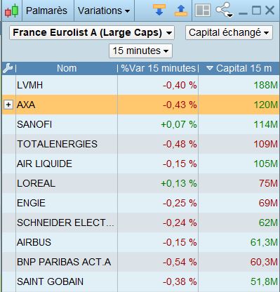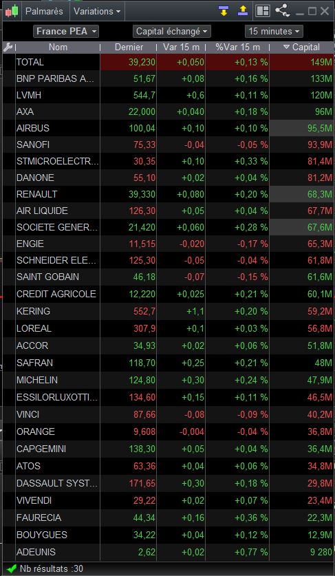A la louche : 125 millions / 32 quart d’heures = 3,9 millions. C’est juste une approximation bien sûr, que j’essaie de calculer car j’ai l’impression que le chiffre affiché est figé sur le capital échangé sur la totalité de la journée. Il me semblerait plus pratique que le palmarès affiche précisément combien de capital a été échangé sur la période choisie. Peut-être une évolution à apporter?