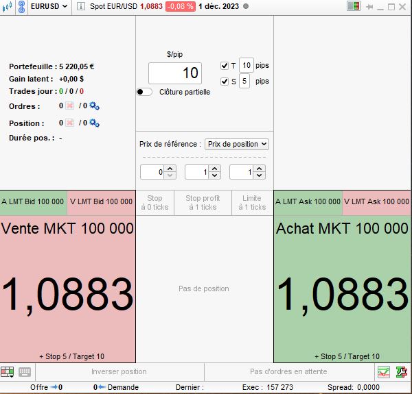 J’utilise le panneau figuré ci-dessous pour entrer une position FOREX en paper trading. Ce panneau me plait car il m’apparait pratique sauf que je ne vois pas comment je puis faire figurer des frais de courtage. Il y a bien tout en bas à droite une mention de “spread” mais la valeur est à zéro et je ne vois pas comment la changer.
