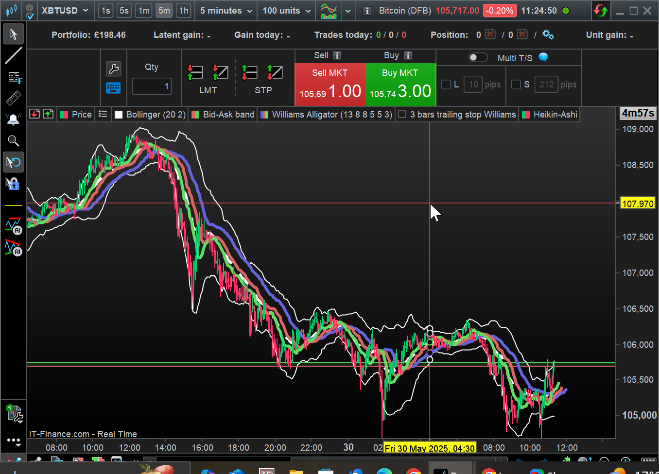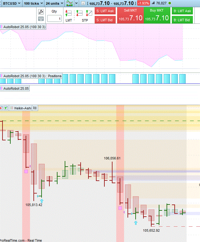 Je suis en cours de test – en paper trading- sur un cours assez nerveux : le BTCUSD. Type de trading : Manuel, scapling (Temps moyen par trade, 11 secondes).