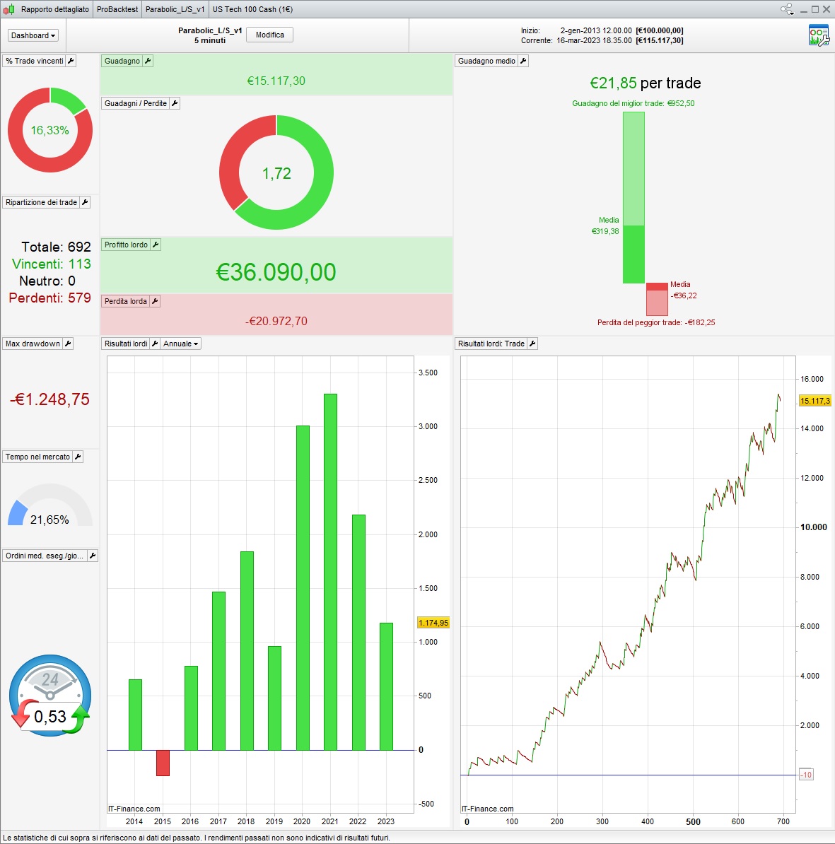 Below the first version of the system (i’m still figuring out if it’s necessary to implement the VWAP condition) on NASDAQ 5M – 1.5 Contracts (939€ atm)