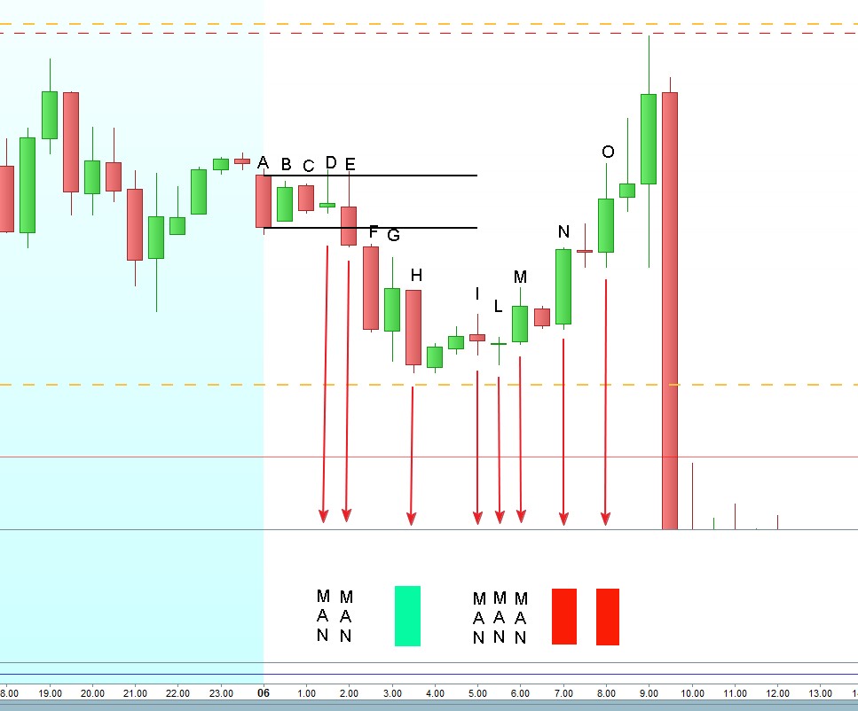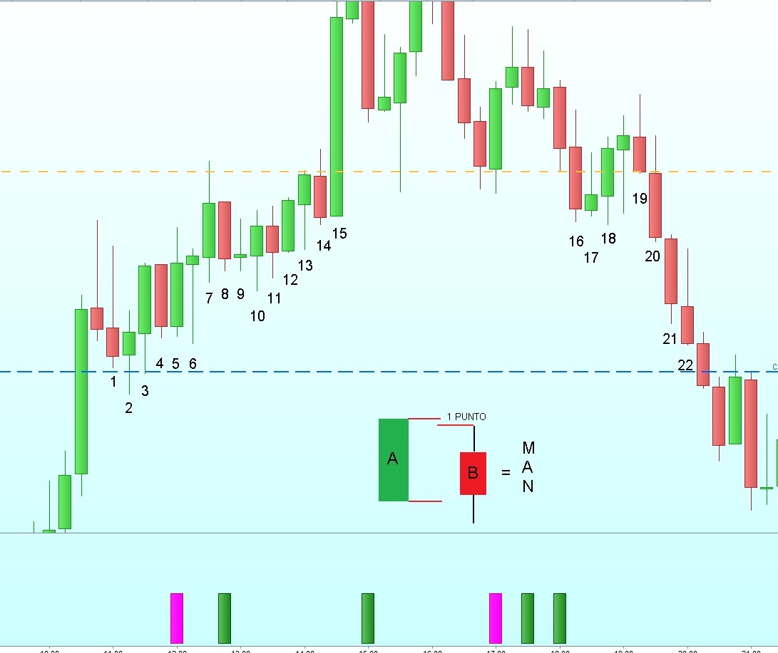 Eccolo, la parte ENGULFING tradizionale non l’ho toccata perché andava bene, ho modificato la parte MAN, cioè l’engulfing sul range, con una tolleranza di 1 punto, sia sul minimo che sul massimo: