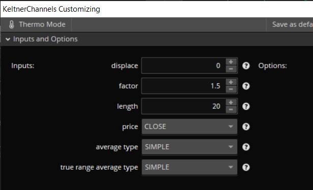 Keltner c’est juste une moyenne encadrée de 2 fois un ATR. On voit dans le tableau que la moyenne sera simple pas exponentielle, on peut “supposer” que le 20 s’applique à elle, et “deviner” que le factor de 1.5 remplacerait probablement le 2 pour multiplier l’ATR? Mais ça ne dit rien sur la période utilisée pour l’ATR, qui pourrait tout aussi bien être fait avec une valeur par défaut différente de 20 que le même 20 supposé pour la moyenne…